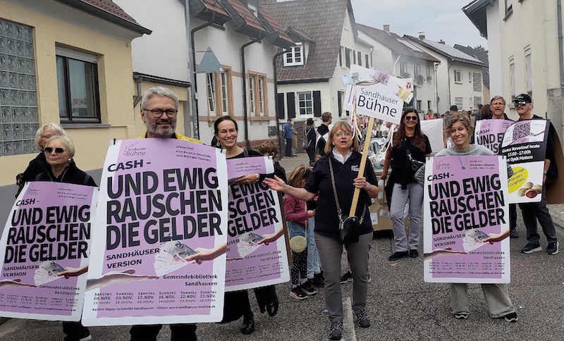 Lang: Zum Kerweumzug waren viele von der Bühne rechtzeitig am Start. Alles war gut vorbereitet: Es standen „Sandwich-Plakate“ zum Umhängen parat und ein sehr schicker Umzugswagen ebenso. Unsere Margit Frei hatte sich bei der Gestaltung mal wieder selbst übertroffen! Natürlich wollten wir beim Umzug vor allem auch Aufmerksamkeit erregen für unser Stück „Cash – Und ewig rauschen die Gelder“ und den Vorverkaufsstart. Und das ist uns voll gelungen! Mit den Plakaten konnten die vielen, vielen Leute an der Umzugsstrecke gar nicht übersehen, worum es uns ging. Ein Blickfang war auch der diesmal sogar mit passender Musik (zum Thema Geld, natürlich!) ausgestattete Wagen. Den Leuten gefiel vor allem die „Sonderausstattung“ mit (nee, natürlich nicht echten!) Geldscheinen und Sparschweinen. Wetter und Stimmung waren auf jeden Fall famos und es hat Spaß gemacht, durch die Straßen zu ziehen!