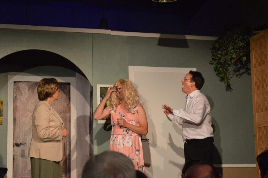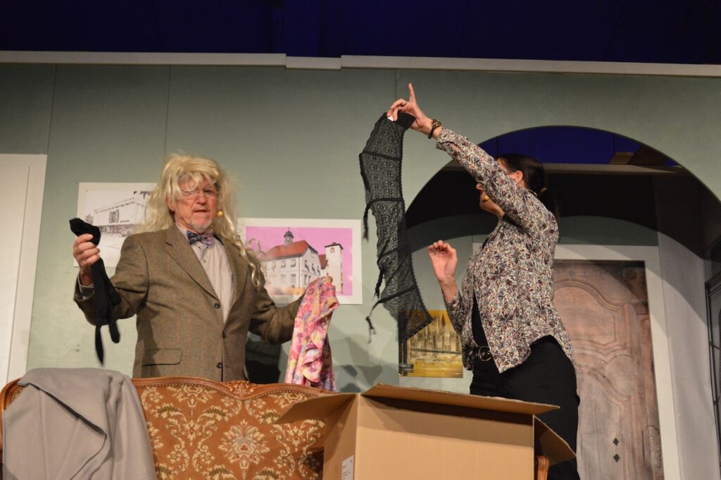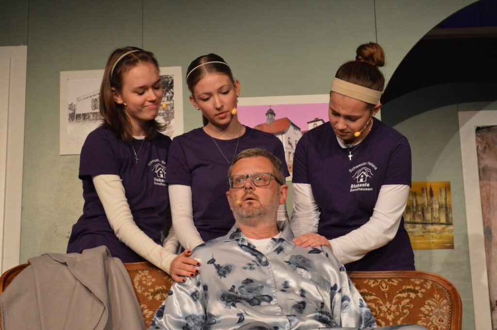 Und wofür das? Erik Schwan (Christian Niemann) hatte ein Problem: Er hatte vor 2 Jahren seine Arbeit verloren, sich aber nicht getraut, dies seiner Frau Linda (Meike Lindemann) zu gestehen. Zum Glück flatterte da der Arbeitslosenhilfe-Scheck seines ehemaligen Untermieters ins Haus und rettete Erik den Hals. Fortan erfand Erik diverse Personen, für die er die Sozialleistungen kassierte. Da steht eines Morgens plötzlich eine Dame von der Außenprüfung des Sozialamtes Sandhausen vor der Tür (Bianca Jung). Alles droht aufzufliegen. Da wird schnell Eriks Freund und Untermieter Norman (Jörg Gottwald) eingeweiht, um aus der Sache herauszukommen. Auch Eriks Onkel Schorsch (Thomas Hirscher) mischt aktiv und passiv bei der ganzen Sache mit. Ein Partnerschafts-Moderator (Roland Schuppe) taucht auch noch auf. Gemeinsam mit drei Schwestern von der Diakonie (Hannah Hogan, Sissi Sandforth und Anne Weiß) versucht er zu helfen. Aber irgendwie verursachen sie nur noch mehr Chaos und Verwicklungen. Am Ende weiß (fast) niemand mehr, wer nun eigentlich wer ist… Wenig beruhigend wirkt auch nicht das Bestatterpaar „Sandmann“ (Michael Filip und Margit Schleibaum). Und dann taucht auch noch eine gewisse Frau Müller-Kriebel (Sabine Hönig) auf, gefolgt von Normans Verlobten Bella (Martina Hörz-Hagedorn) und Ihrer Mutter (Martina Dangel). Bringt das endlich Beruhigung in das Geschehen? Natürlich nicht! Aber dem Publikum brachte es am Samstag einen riesen Spaß! Und uns erst! Von kleinen Pannen im Ablauf ließen wir uns nicht aufhalten, jeder achtete auf jeden und so war es für alle Beteiligten eines: Eine rundum gelungene Premiere! Die wurde mit viel Applaus bedacht! Hatten wir schon einmal ein so tolles Premierenpublikum? Vielleicht, aber auf keinen Fall ein Besseres! Viel Applaus gab es auch für Anke, unseren Rettungsanker und Souffleuse. Ordentlich geklatscht wurde auch für unsere Bühnenfeen Margit Frei und Heide Schmitt, die wieder einen Bühnenbild der Extraklasse gezaubert hatten. Und wer war noch wichtig für diesen gelungenen Abend? Ganz klar, unsere Technikcrew! Am Wochenende im Einsatz waren Philip Weiß, Steffen Schmitt, Michael „Mutze“ Reith, Qiao-Zhi Wu, Matej Sir, und Simon Kilian. Vielen Dank an Euch, Jungs! Vielen Dank auch an alle anderen, die wir vielleicht vergessen haben!